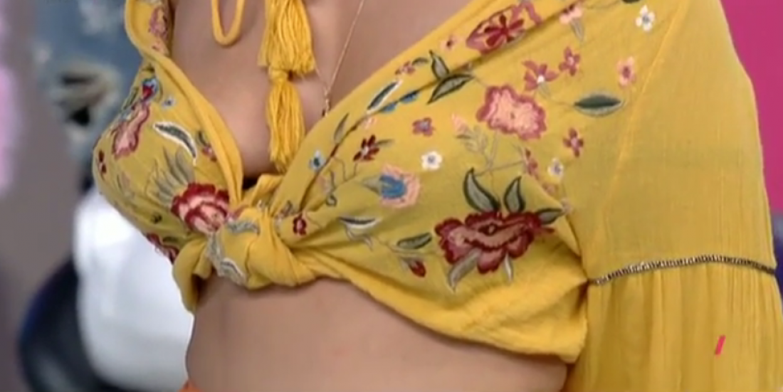 Στο επεισόδιο της Δευτέρας στην πρώτη εμφάνιση στο σόου μόδας την είδαμε με ένα πουκάμισο -δεν το λες φόρεμα- μέσα από το οποίο φαινόντουσαν τα οπίσθια της, σήμερα επέλεξε να μας δείξει το στήθος της.