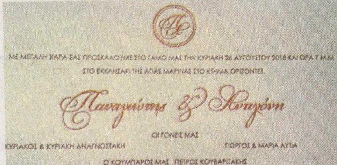 Σύμφωνα με την Real News , το μυστήριο πραγματοποιήθηκε στο εκκλησάκι της Αγίας Μαρίνας στο Κτήμα Ορίζοντες στο Κορωπί, σε κλειστό οικογενειακό κύκλο.