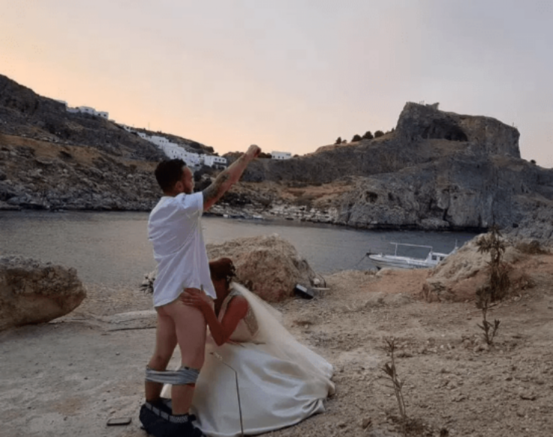 Ένα ζευγάρι Βρετανών που ήρθανα να παντρευτούν στην Λίνδο της , μάλλον λάτρεψαν την «φαεινή» ιδέα των Ολλανδών και φωτογραφήθηκαν να ερωτοτροπούν με το γαμπριάτικο κοστούμι και το νυφικό, και ο επαγγελματίας φωτογράφου του γάμου να απαθανατίζει τα πάντα!