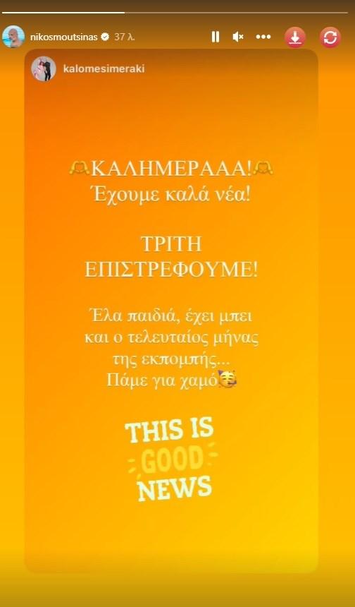 Ωστόσο, πριν από λίγες ώρες ο Νίκος Μουτσινάς έκανε την πρώτη του ανάρτηση μετά την περιπέτεια με την υγεία του. Ο παρουσιαστής έκανε repost ένα story από τον λογαριασμό του “Καλό Μεσημεράκι” στο Instagram που ανέφερε πως η εκπομπή επιστρέφει την Τρίτη 6/06.