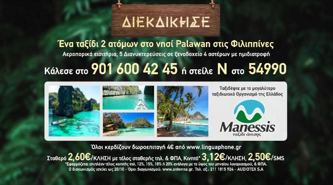 Το Nomads, το απόλυτο ριάλιτι περιπέτειας και δράσης, που έκανε το ντεμπούτο» του στην Ευρώπη και συγκεκριμένα για πρώτη φορά στην Ελλάδα, αποκλειστικά, μέσα από τη συχνότητα του ΑΝΤ1, σας δίνει τώρα τη δυνατότητα να διεκδικήσετε, ένα από τα επτά ταξίδια (δύο ατόμων), στο νησί Palawan, στις Φιλιππίνες, σε ένα από τα πιο απομακρυσμένα, πανέμορφα και εξωτικά μέρη του πλανήτη.