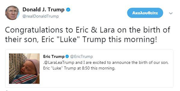 Ο ευτυχής μπαμπάς ανέβασε την φωτογραφία του νεογέννητου παιδιού του στο Twitter, αποκαλύπτοντας και το όνομά του, Ερικ «Λουκ» Τραμπ, ενώ μέσω του ίδιου μέσου κοινωνικής δικτύωσης, ευχήθηκε και ο Ντόναλντ.