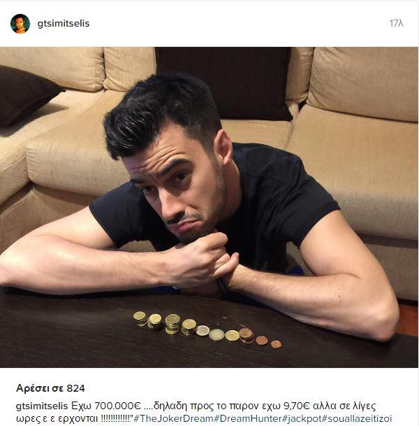 Αμέ, ο Γιάννης με το γνωστό του χιούμορ ανέβασε μια φωτογραφία με την λεζάντα: "Έχω 700.000 ευρώ...δηλαδή προς το παρόν έχω 9,70 αλλά σε λίγες ώρες έρχονται...! Τζόκερ time!"