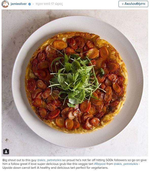 Η τάρτα καρότου για χορτοφάγους που ανάρτησε ο Άκης Πετρετζίκης πριν από 4 μέρες στον λογαριασμό του στο Instagram, εντυπωσίασε τον Jamie Oliver τόσο που την ανάρτησε στον δικό του λογαριασμό!