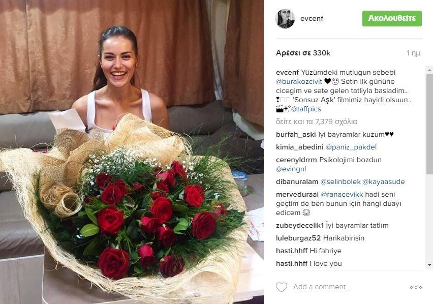 Ο Μπουράκ τής χάρισε ένα πανέμορφο μπουκέτο με κόκκινα τριαντάφυλλα για να ξεκινήσει με χαμόγελο η Φαχριγιέτ την πρώτη μέρα στο πλατώ όπου γυρίζεται η ταινία στην οποία πρωταγωνιστεί.