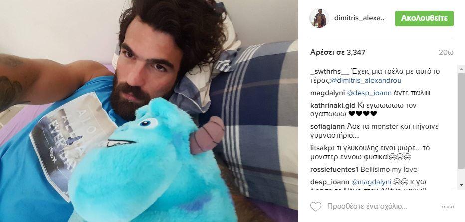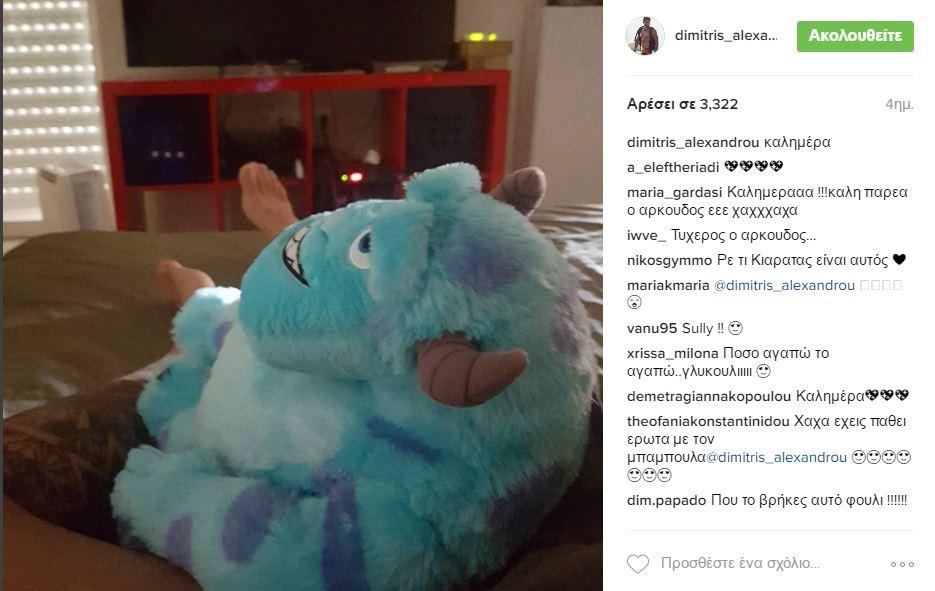O Δημήτρης τελευταία ανεβάζει ανελλιπώς φωτογραφίες με ένα λούτρινο αρκουδάκι, τον μπαμπούλα από την ταινία κινουμένων σχεδίων, Μπαμπούλας Α.Ε. Πώς γίνεται να κρύβει μια τόσο ευαίσθητη ψυχή ο Αλεξάνδρου δεν ξέρουμε αλλά κάτι υποπτευόμαστε...