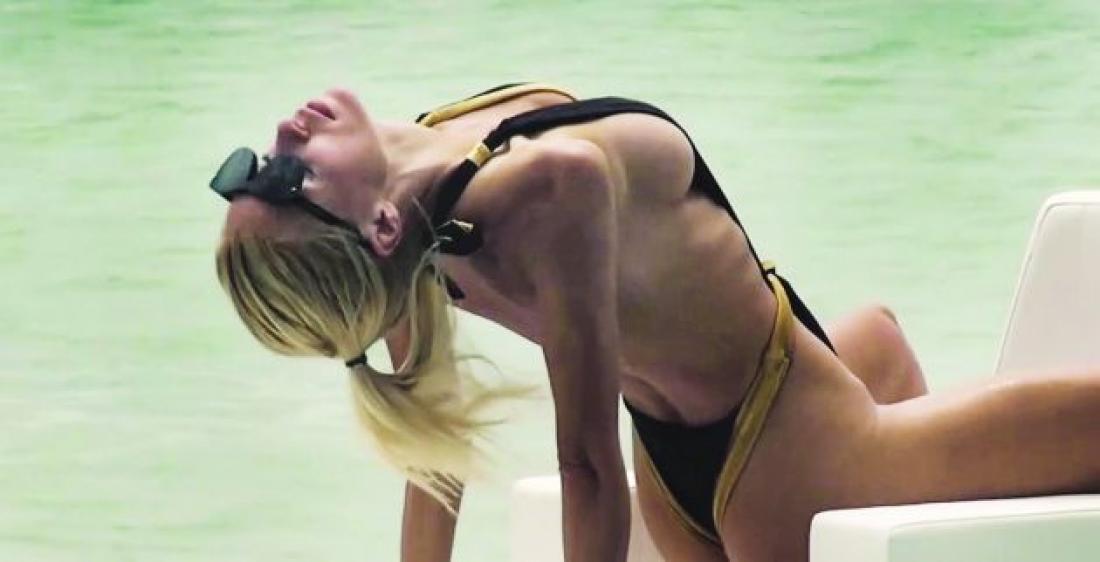 Παγάκια, σαμπάνια, στρινγκ μαγιό, θάλασσα. Ολα τα πιθανά μέσα σε μια γενναία προσπάθεια της μοντέλας να νιώσει υγρή! Να σβήσει με τα παγάκια την κάψα της, που προήλθε και από τη ζέστη, αλλά και από το «καυτό» attitude της, βεβαίως βεβαίως!