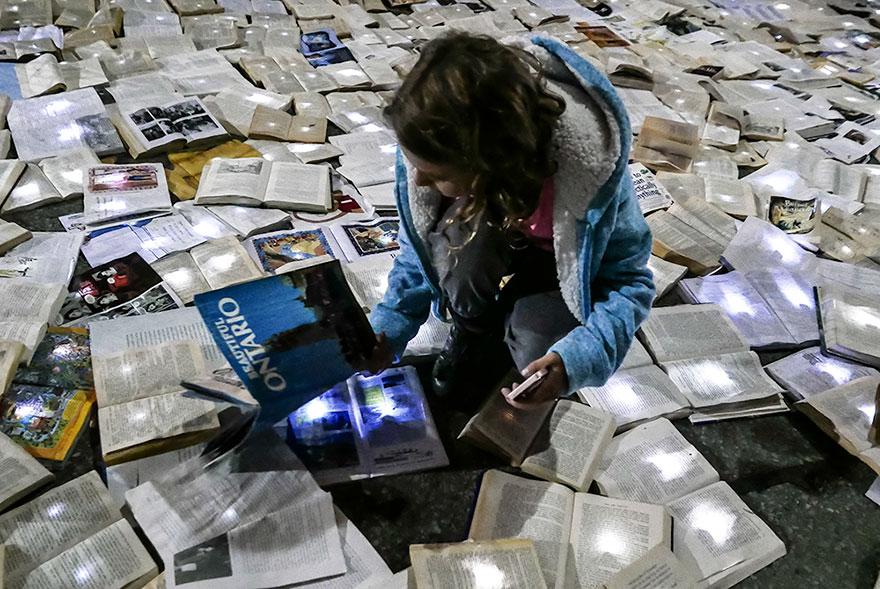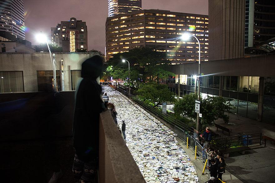 Λογοτεχνία εναντιον Τράφικ. Μια πρωτοβουλία της Luzinterruptus, μιας ανώνυμης ομάδας Καναδών που επεμβαίνουν με χάπενινγκς σε δημόσια μέρη. Αυτή τη φορά επέλεξε να μετατρέψει τους πιο πολυσύχναστους δρόμους του Τορόντο σε ποτάμι βιβλίων!