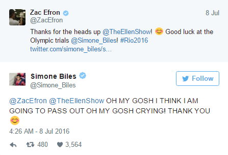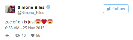 Η Σιμόν Μπάιλς μπορεί να είναι χρυσή Ολυμπιονίκης, αλλά όταν πρόκειται για τον Ζακ Εφρον είναι το ίδιο...ερωτοχτυπημένη όπως τόσες άλλες 19χρονες. Μάλιστα το 2013 το είχε δηλώσει ξεκάθαρα με ένα tweet, που είχε γίνει...διάσημο.