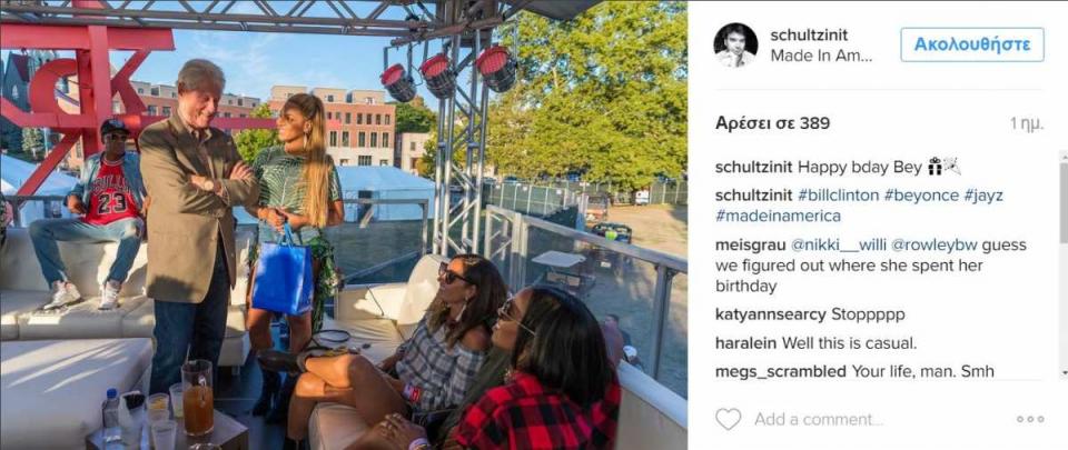 Η Queen B εν όψει του φεστιβάλ «Made America» που διοργάνωσε ο Jay -Z την ημέρα εκείνη, συνάντησε τον Bill Clinton, πρώην Πρόεδρο των ΗΠΑ και σύζυγο της Hillary Clinton, η οποία κατεβαίνει φέτος για το χρίσμα της Προέδρου.