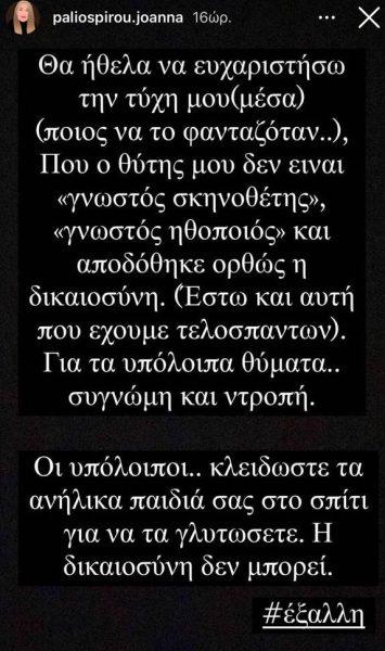 «Θα ήθελα να ευχαριστήσω την τύχη μου (μέσα) που ο θύτης μου δεν ήταν “γνωστός σκηνοθέτης”, “γνωστός ηθοποιός” και αποδόθηκε δικαιοσύνη. (Έστω και αυτή που έχουμε τέλος πάντων). Για τα υπόλοιπα θύματα, συγγνώμη και ντροπή. Οι υπόλοιποι κλειδώστε τα ανήλικα παιδιά στο σπίτι για να γλιτώσετε. Η δικαιοσύνη δεν μπορεί ».
