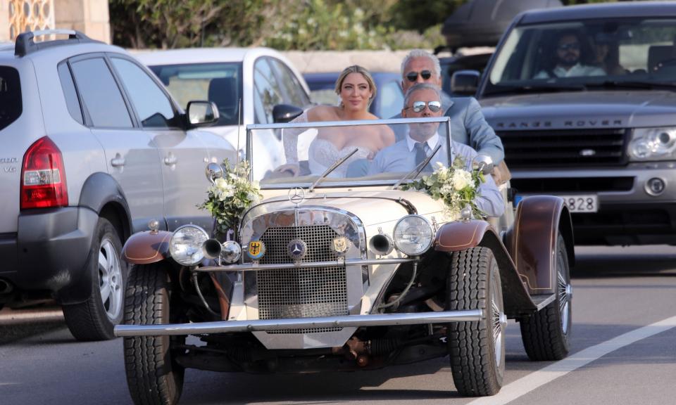 Η νύφη κατέφθασε στην εκκλησία με ένα αυτοκίνητο αντίκα και ο Πάνος Μουζουράκης έτρεξε στην πόρτα για να την υποδεχθεί και να την οδηγήσει στο σημείο όπου θα γινόταν το μυστήριο, στον προαύλιο χώρο της εκκλησίας.