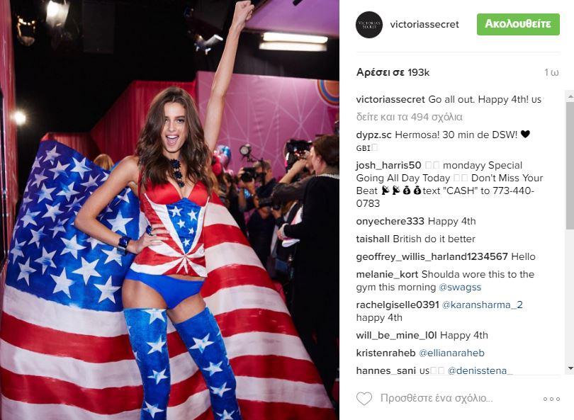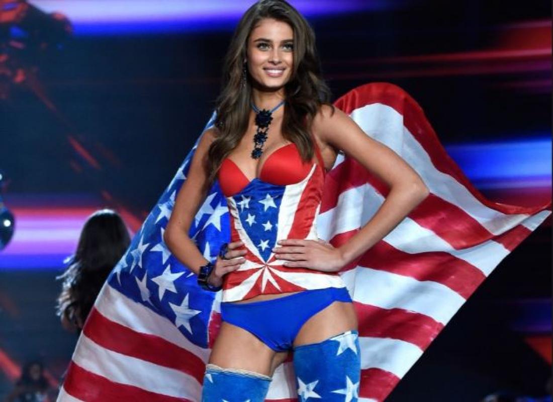 Το μοντέλο Τέιλορ Χιλ σε πασαρέλα της Victoria's Secret με την λεζάντα: Happy 4th!