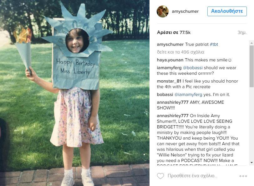 Η ηθοποιός Amy Schumer ανέβασε μια αστεία φωτογραφία με την ίδια σε παιδική ηλικία, ντυμένη "Άγαλμα της Ελευθερίας" και εύχεται: Ηappy Birthday Miss Liberty!