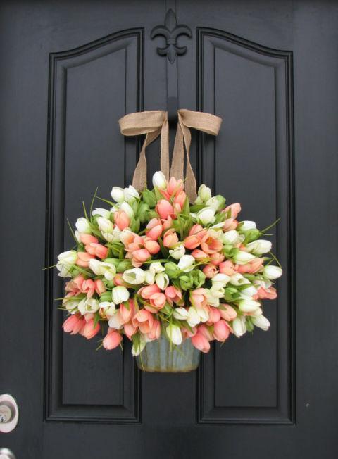 Και κάτι τελευταίο και τελείως διφορετικό: Μια ομπρέλα και ένας μικρός εμαγιέ κουβάς γεμάτα τουλίπες παίρνουν τη θέση των στεφανιών