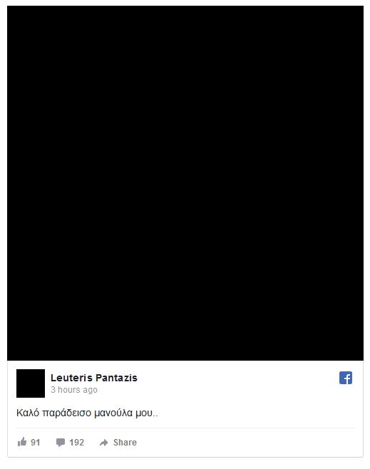 Ο Λευτέρης Πανταζής αποχαιρέτισε τη μητέρα του και μέσω του προσωπικού του λογαριασμού στο Facebook, με μια μαύρη φωτογραφία, την οποία συνοδεύει με το συγκινητικό σχόλιο: «Καλό παράδεισο μανούλα μου ».