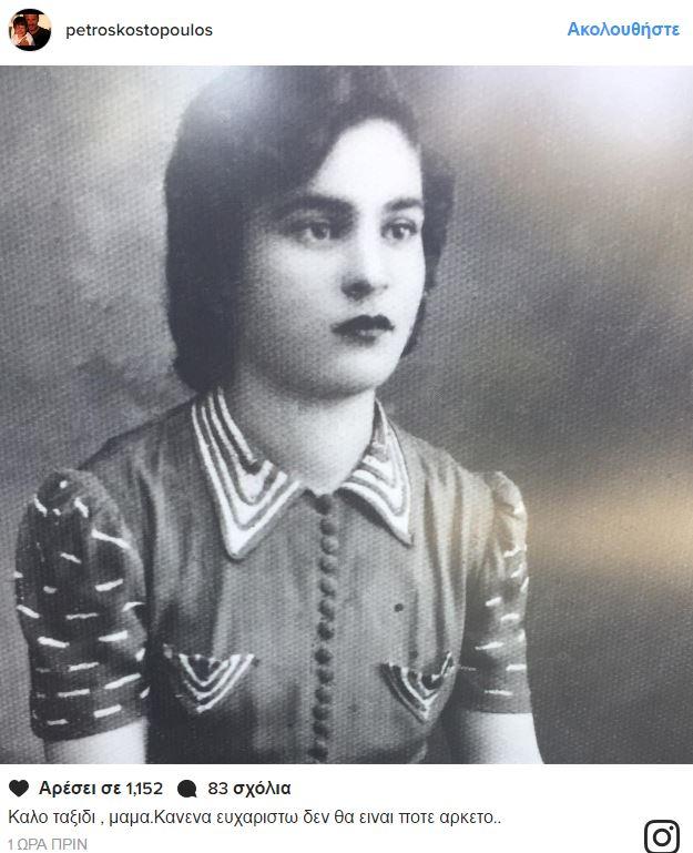 Δύσκολες ώρες για τον Πέτρο Κωστόπουλο ...Με μία τρυφερή ανάρτησή του στον προσωπικό του λογαριασμό στο Instagram, αποχαιρέτισε την αγαπημένη του μητέρα που έφυγε από τη ζωή.