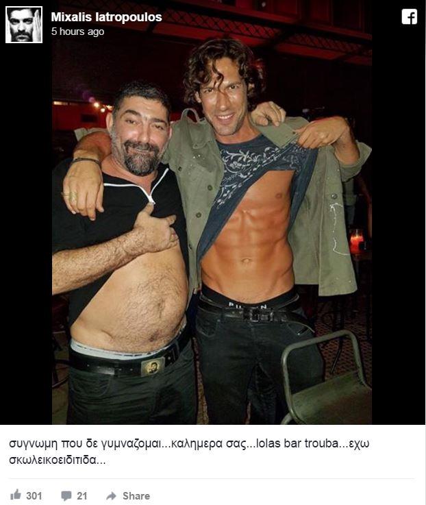 Ο γνωστός ηθοποιός συναντήθηκε σε νυχτερινό μαγαζί με τον Γιάννη Σπαλιάρα και αποφάσισαν να σηκώσουν τις μπλούζες τους και να ποζάρουν στον φωτογραφικό φακό.