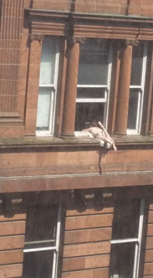 Αναταραχή στην ήσυχη περιοχή Μέρτσαντ Σίτι της Γλασκώβης. Εργαζόμενοι σε γραφεία κυριολεκτικά πετάχτηκαν από τις καρέκλες τους όταν στον τρίτο όροφο του απέναντι κτιρίου νεαρή γυναίκα περίπου κρεμάστηκε από το παράθυρο της για να κάνει ηλιοθεραπεία.