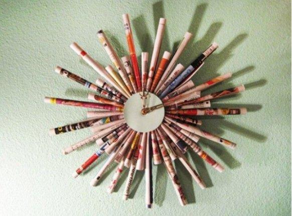 Όσο για τα παλιά σου περιοδικά και τις εφημερίδες, αντί να τα πετάξεις μπορείς να τα χρησιμοποιήσεις και αυτά. Αρκεί μόνο να κάνεις μερικές από τις σελίδες τους ρολό και αφού κόψεις ένα πλαστικό κομμάτι σε κύκλο, να κολλήσεις τα ρολά επάνω του, αφήνοντας χώρο στο κέντρο για τον μηχανισμό.