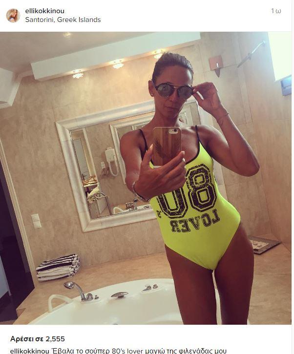 Η Έλλη Κοκκίνου στην Σαντορίνη (αντιγράφει την Φαίη) με επίσης κίτρινο ολόσωμο μαγιό