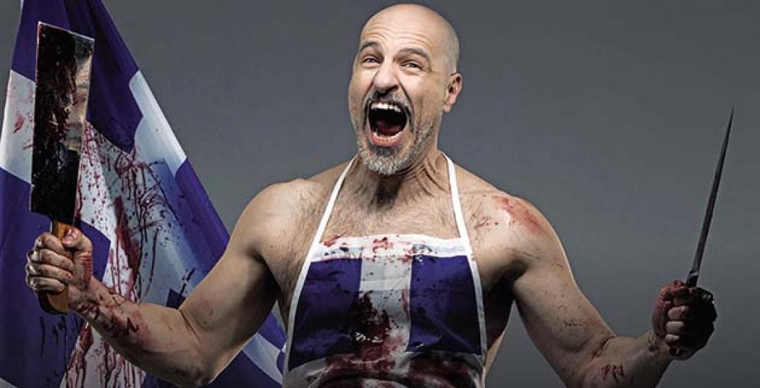 Ο βρήκε αρμόζουσα ημερομηνία τις παραμονές της , για να ενημερώσει τα μέσα για τα «μαθήματα» Ιστορίας που θα παραδίδει από την Παρασκευή 3 Νοεμβρίου στο Μικρό Παλλάς. Ο stand up comedian, για τις ανάγκες της παράστασής του με τίτλο «Η Ιστορία του ελληνικού έθνους - αλλιώς», φωτογραφήθηκε με μια ματωμένη ελληνική σημαία για ποδιά, έναν μπαλτά και ένα μαχαίρι στα χέρια.