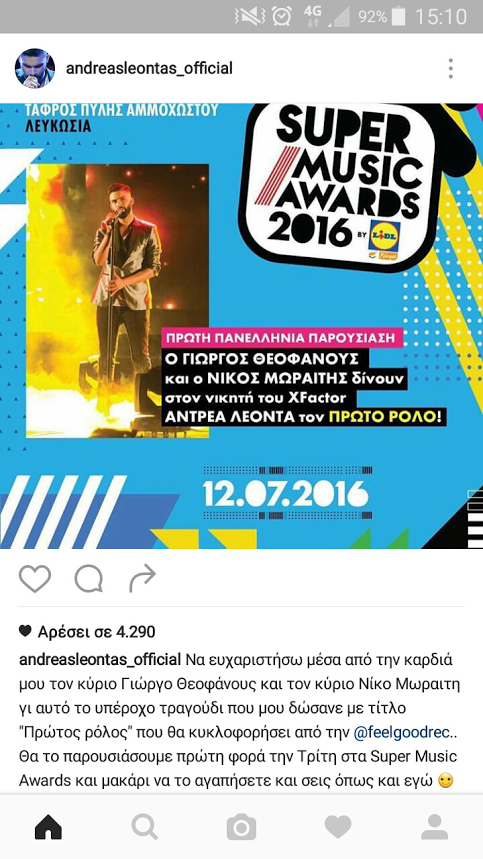 Ο μεγάλος νικητής του X-Factor Αντρέας Λέοντας περήφανος αποκάλυψε το πρώτο του τραγούδι με τον συμβολικό τίτλο "Πρώτος Ρόλος" του Γιώργου Θεοφάνους και του Νίκου Μωραϊτη, το οποίο θα το παρουσιάσει στα Super Music Awards 2016 στην Ταφρο Πύλης Αμμoχώστου στην Λευκωσία.