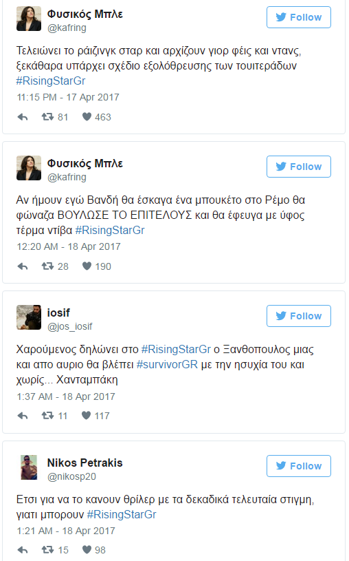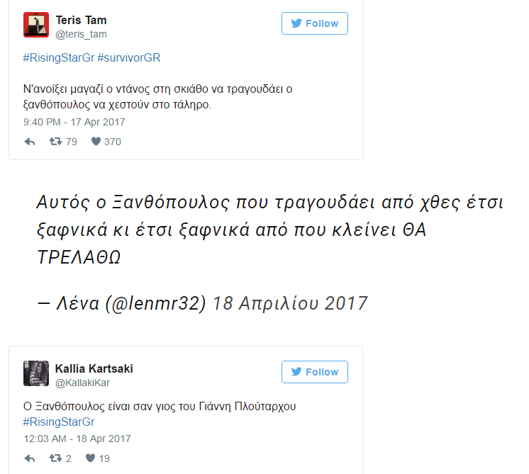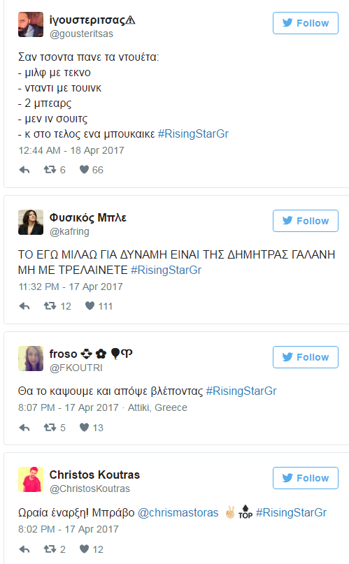 Το Twitter δεν παίρνει φωτιά μόνο για το Survivor , καθώς το Rising Star έκανε ρεκόρ με 13.000 tweets το τελευταίο του βράδυ στο live-μαραθώνιο που είχε τελικό νικητή τον Γιάννη Ξανθόπουλο.