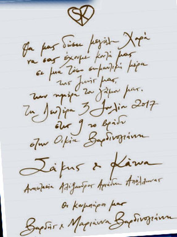 Το προσκλητήριο ήταν χειρόγραφο με χρυσά γράμματα και φέρει τα αρχικά των μελλόνυμφων που είναι «κλεισμένα» μέσα σε μία καρδιά.