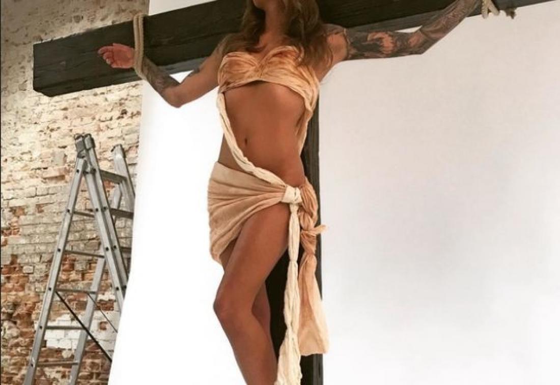 Το μοντέλο από την Γερμανία, είναι παρουσιάστρια και μέλος του κόμματος της Σοφία Τομάλα, αναπαρίστανε τη Σταύρωση του Ιησού λίγες μέρες πριν από τον εορτασμό της Γέννησής του.