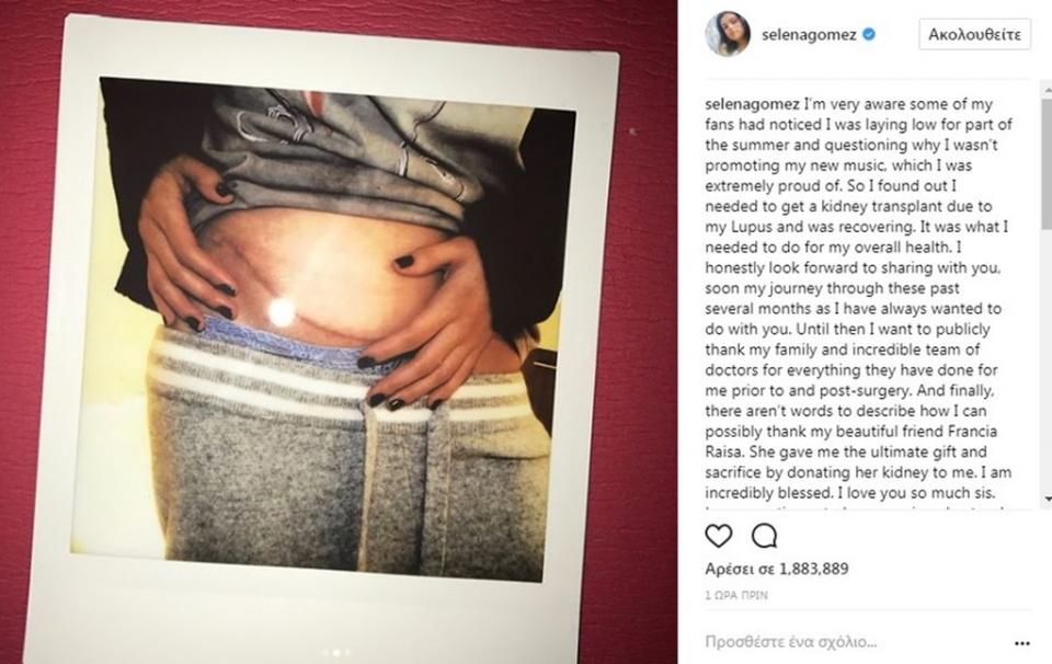 Στην μια φωτογραφία βλέπουμε την Selena με την καλή της φίλη που της έδωσε το νεφρό της ξαπλωμένες στο κρεβάτι, ενώ σε μια δεύτερη, η τραγουδίστρια δείχνει στους θαυμαστές της την τομή από την επέμβαση.