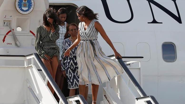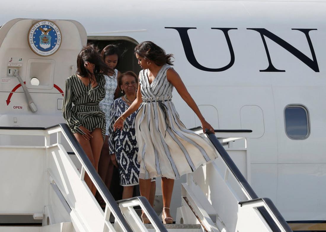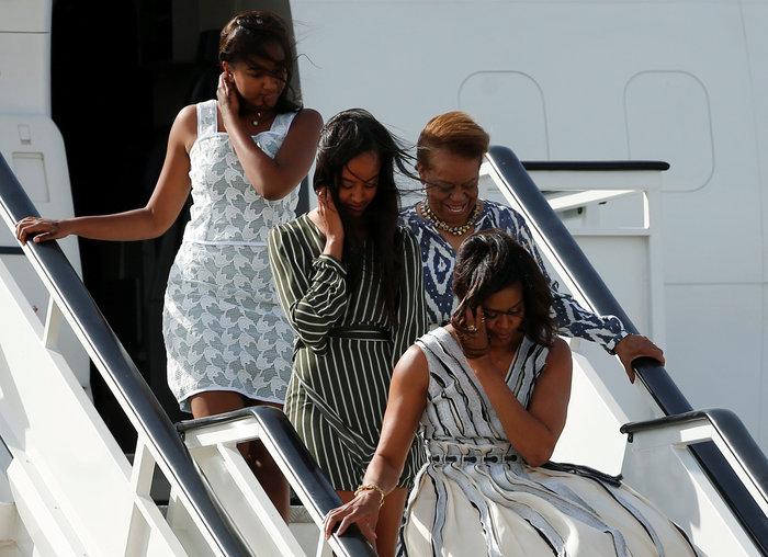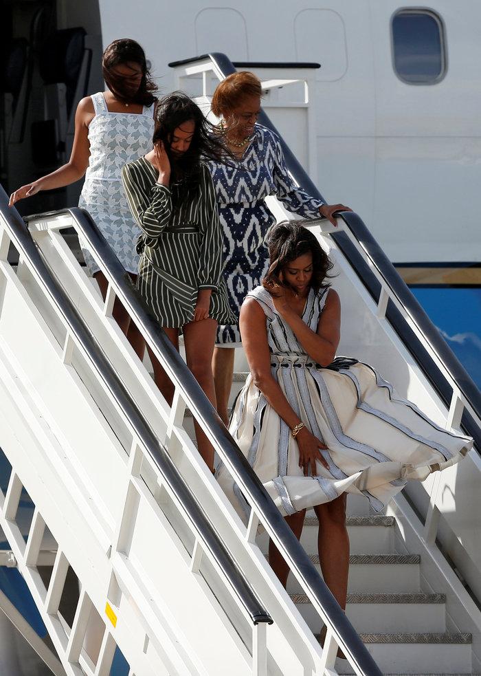 Πρώτη βγήκε η Μισέλ Ομπάμα η οποία όταν κατάλαβε ότι φυσούσε πολύ γύρισε προς τις κόρες της και τις συμβούλεψε να προσέξουν πώς θα βγουν.