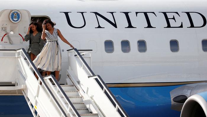 Οι τρεις γυναίκες του Αμερικανού προέδρου προσγειώθηκαν με το προεδρικό αεροσκάφος στη Μαδρίτη και ο δυνατός αέρας δυσκόλεψε την αποβίβασή τους.