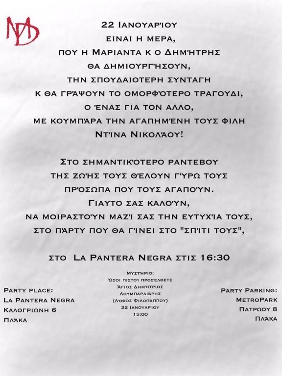 «22 Ιανουαρίου είναι η μέρα, που η Μαριάντα και ο Δημήτρης θα δημιουργήσου,, την σπουδαιότερη συνταγή και θα γράψουν το ομορφότερο τραγούδι, ο ένας για τον άλλο, με κουμπάρα την αγαπημένη τους φίλη Ντίνα Νικολάου! Στο σημαντικότερο ραντεβού της ζωής τους θέλουν γύρω τους πρόσωπα που τους αγαπούν», αναφέρει χαρακτηριστικά το προσκλητήριο.