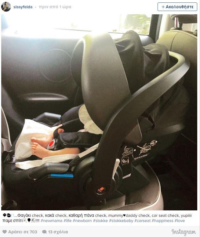 H μπέμπα φαίνεται μέσα στο port bebe , καθ'οδόν για το σπίτι. «Φαγάκι check, κακά check, καθαρή πάνα check, mummy-daddy check, car seat check, yupiiii παμε σπίτι!», έγραψε η Σίσσυ Φειδά ανεβάζοντας τη φωτογραφία.