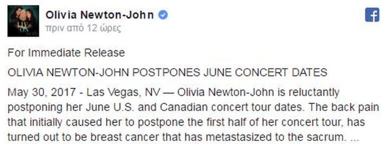 Η Olivia Newton-John αναβάλει τις συναυλίες της στις Η.Π.Α. και στον Καναδά, που ήταν προγραμματισμένες για τον Ιούνιο.
