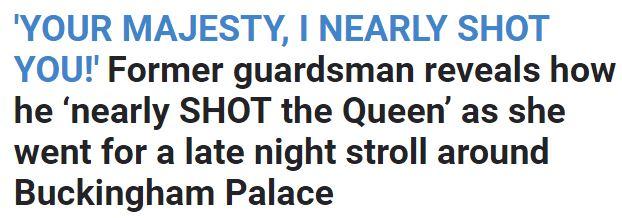 Η βασίλισσα πήγε στον κήπο και βρέθηκε στο στόχαστρο ενός από τους φρουρούς της στις 03:00 τα ξημερώματα. Ο φρουρός που δεν την αναγνώρισε νόμιζε ότι επρόκειτο για εισβολέα και παραλίγο να την πυροβολήσει.