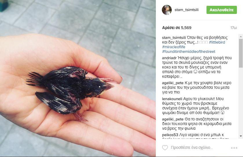 Η Σταματίνα Τσιμτσιλή κράτησε τρυφερά ένα μικρό πουλάκι για το οποίο έγραψε χαρακτηριστικά: «Όταν θες να βοηθήσεις και δεν ξέρεις πως».