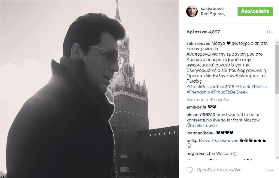 Έτοιμος είναι ο Σάκης Ρουβάς για τη σημερινή εμφάνισή του στο Κρεμλίνο ως επικεφαλής του καλλιτεχνικού προγράμματος, εκδήλωσης για την ελληνορωσική φιλία. Ο Σάκης θα ερμηνεύσει επιτυχίες του στα ελληνικά, αλλά και στα ρώσικα, κάτι που έχει ήδη προκαλέσει το ενδιαφέρον τόσο του ελληνικού, όσο και του ρωσικού Τύπου! Η εκδήλωση γίνεται στο πλαίσιο του εορτασμού του έτους 2016 που είναι αφιερωμένο στην πολιτιστική συνεργασία Ελλάδας Ρωσίας.