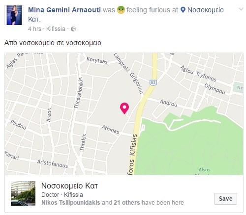 Σήμερα το πρωί η Μ. Αρναούτη έκανε check in στο , ενώ οι φίλοι της ρωτούσαν γιατί μπήκε ξανά στο νοσοκομείο.