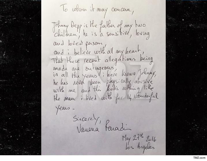 Η Vanessa Paradis με την οποία ο διάσημος ηθοποιός έχει αποκτήσει 2 παιδιά , την 17χρονη Lily - Rose και τον 14χρονο Jack , έστειλε χειρόγραφη επιστολή στο ΤΜΖ με την οποία αμφισβητεί τους ισχυρισμούς της Χέρντ και επιμένει ότι ο Τζώνυ Ντεπ είναι ένας στοργικός και ευαίσθητος άνθρωπος που ποτέ δεν θα χρησιμοποιούσε βία κατά των γυναικών .Μάλιστα χαρακτηρίζει εξωφρενικά τα όσα λέει η Χέρντ.
