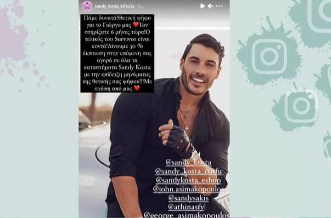 «Πάμε δυνατά. Θετική ψήφο για τον Γιώργο μας. Τον στηρίξαμε έξι μήνες τώρα. Ο τελικός του Survivor είναι κοντά. Δίνουμε 30% έκπτωση στην επόμενη σας αγορά σε όλα τα καταστήματά μας, με την επίδειξη μηνύματος της θετικής σας ψήφου. Με αγάπη από εμάς », έγραφε η ανάρτηση.