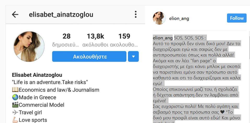"SOS SOS SOS Αυτό το προφίλ δεν είναι δικό μου! Δεν το διαχειρίζομαι εγώ και σαφώς δεν με αντιπροσωπεύει όπως και πολλά αλλά! Ακόμα και αν λέει "fan page" ο διαχειριστής με έχει κάνει μπλοκ με σκοπό να παριστάνει εμένα σαν πρόσωπο αυτό καθαυτό και ότι το διαχειρίζομαι και καλά εγώ! Όποιος επικοινωνεί μαζί του, ή σχολιάζει ή δέχεται απάντηση δεν τη λαμβάνει από εμένα! Σας ευχαριστώ πολύ! Με πολύ αγάπη και σεβασμό προς τα πρόσωπα σας. Το δικό μου προφίλ είναι αυτό εδώ! Και μόνο αυτό έχω! P.S.: Είναι το ίδιο προφίλ που είχα ανεβάσει και την πρώτη φορά!" έγραψε η Survivor Ελισάβετ Αϊνατζόγλου για να ενημερώσει τους θαυμαστές της.