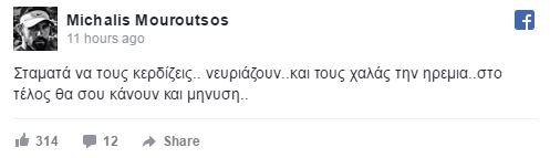 Τα σχόλια αυτά δεν θα μπορούσε να μη σχολιάσει ο Μιχάλης Μουρούτσος. Μέσα από τον λογαριασμό του στο Facebook έγραψε: «Σταματά να τους κερδίζεις... νευριάζουν... και τους χαλάς την ηρεμία... Στο τέλος θα σου κάνουν και μήνυση».