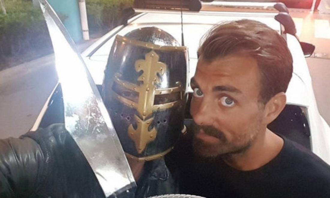 Φορώντας περικεφαλαία και έχοντας στο χέρι ένα σπαθί, στάθηκε μπροστά στον πρώην παίκτη των «Διασήμων» για να τον προστατέψει από τα φώτα των δημοσιογράφων, αλλά και τις κακές γλώσσες.