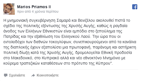 Συνολικά γίνονται 19 συλλήψεις, πέντε βουλευτών και 13 στελεχών. Δύο μέρες μετά, ο Μάριος Πρίαμος Ιωαννίδης, ο παίκτης του Survivor, ξεσπά μέσα από τον λογαριασμό του στο facebook: