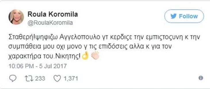 Ρούλα Κορομηλά: « «Σταθερή!Ψηφίζω Αγγελοπουλο γιατί κέρδισε την εμπιστοσύνη και την συμπάθεια μου όχι μόνο για τις επιδόσεις αλλά και για τον χαρακτήρα του. Νικητής!??».
