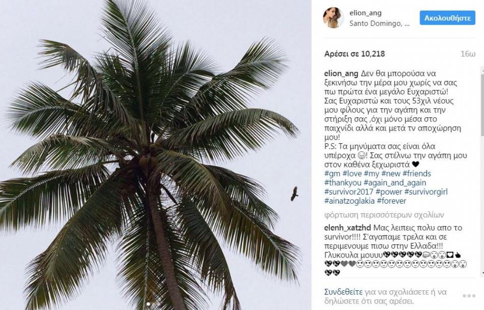 Πιο συγκεκριμένα έγραψε: "Δεν θα μπορούσα να ξεκινήσω την μέρα μου χωρίς να σας πω πρώτα ένα μεγάλο Ευχαριστώ! Σας ευχαριστώ και τους 53χιλ νέους μου φίλους για την αγάπη και την στήριξή σας, όχι μόνο μέσα στο παιχνίδι αλλά και μετά την αποχώρηση μου! Ps: Τα μηνύματά σας είναι όλα υπέροχα! Σας στέλνω την αγάπη μου στον καθένα ξεχωριστά! ".