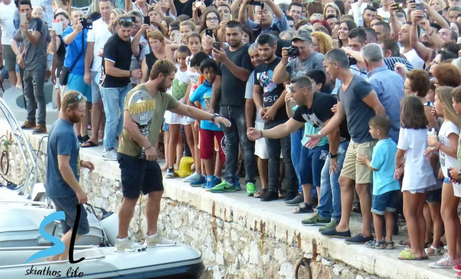 Η Σκιάθος χθες το βράδυ είχε μια μεγάλη γιορτή που ξεκίνησε από το λιμάνι, όπου πλήθος κόσμου περίμενε τον νικητή. Ο Ντάνος έφτασε πάνω σε ένα σκάφος και οι συντοπίτες του τον υποδέχτηκαν με χειροκροτήματα και ανθοδέσμες.