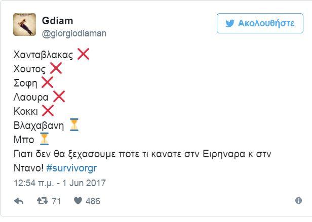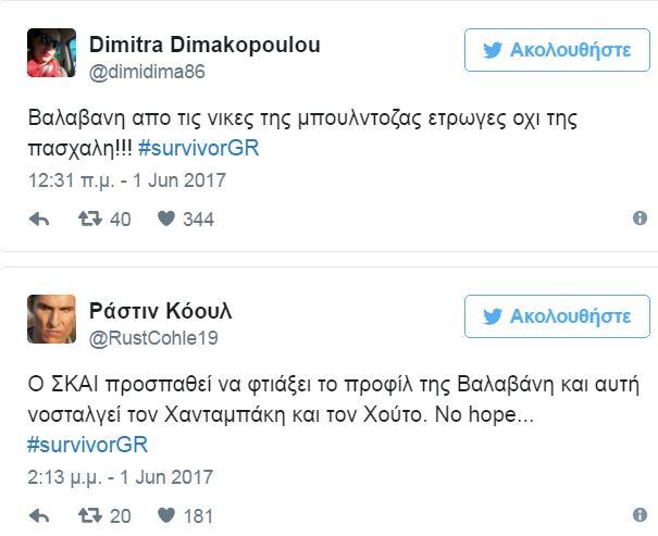Αυτή της η δήλωση έγινε η αφορμή για ένα νέο κύμα μίσους, μετά τα tweets για νέα κλίκα με αρχηγό την Βαλαβάνη. Η "μπουλντόζα" του Survivor, μπορεί να έφυγε νωρίς αλλά θα ήταν διαφορετική εξέλιξη της ομάδας των Διασήμων, αν έμενε στον Άγιο Δομίνικο. Η Ειρήνη Παπαδοπούλου ήταν μια πολύ δυνατή παίκτρια, κάτι το οποίο η Ευρυδίκη Βαλαβάνη δεν το σχολίασε...